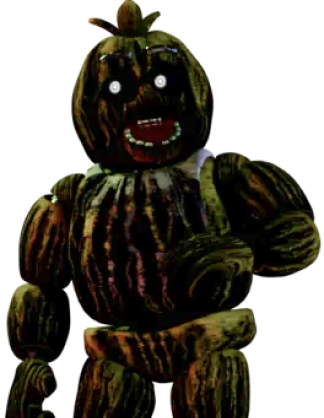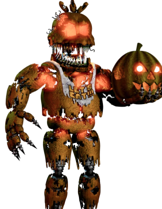 Jack-O-Chica is a Halloween-themed revamped variant of Nightmare Chica, first appearing in Five Nights at Freddy's 4, where she replaces the original antagonist in the Halloween version. She is also shown to have a vengeful, yet mocking disposition. Her voice is low-pitched and edited with television-like static noises. The first notable difference is that her color scheme is completely orange in the Halloween style. Her complexion was dark golden rather than yellow. In place of her normal endoskeleton eyes, the sockets are very bright orange, much like a jack-o'-lantern. A similar effect appears to have occurred on Jack-O-Chica's entire body, as it can be seen very commonly around her shoulder sockets and drains out of her stomach. Her endoskeleton head is completely absent, while her endoskeleton teeth remain. A large green jack-o-lantern replaces the Cupcakes at Nightmare Chica. Her bib is the only feature that remains the same.